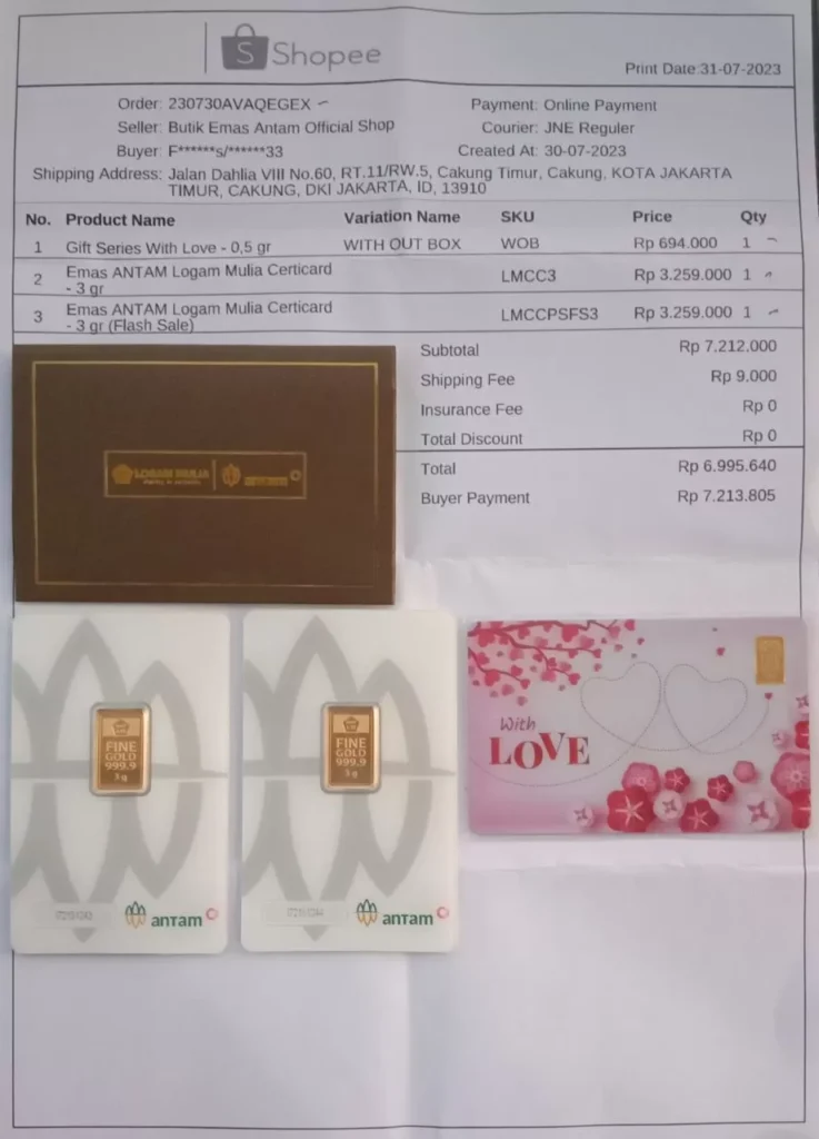 Spesifikasi Produk; Berat Emas 1 gram Kemurnian 99.99% Tebal Emas 0.35 mm Dimensi Emas 15.6 x 9.4 mm Tebal Kartu 0.76 mm Dimensi Kartu 85 x 54 mm